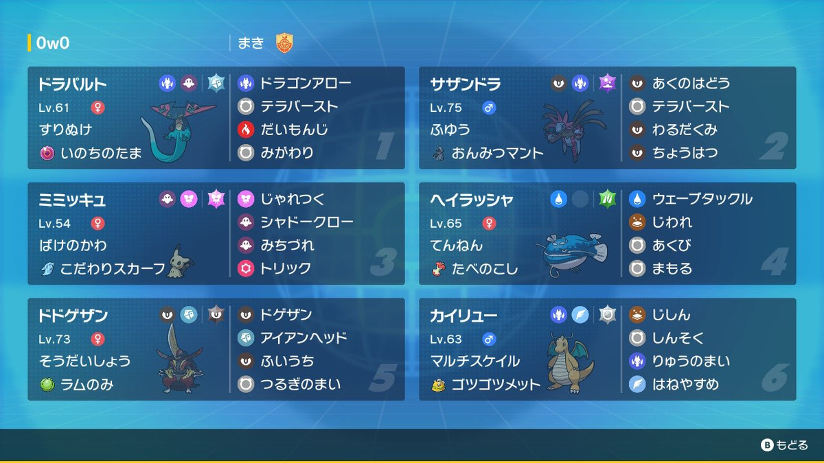 ・こっちのバドでうまく積むことができてもメタモンに切り返されてしまうのが辛かったため、メタモンをテラスを切ることによって逆に起点にできて壁ともそこそこ相性の良さそうなノマテラ龍舞カイリューと、ここまでだと勝てない受けループに強い呪いキョジオーンを採用して構築が完成した。