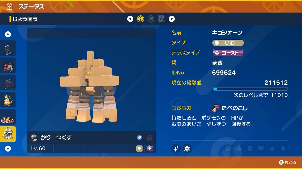 最強のバドレックス。壁+B振りによってDは元からそこそこ高いためほぼ全てのポケモンを起点にすることが可能なヤバすぎポケモン。ステロを撒いて巧み+移動を積めることができた場合ほとんど止めることができない。テラスに関してはフェアリー、水も考えていたが、ワダチロンゲが苦手なラオスに強いかつ殴りながら回復できる草テラスを採用した。草テラスは強い分相手にケアされやすく噛み合いになってしまうのが欠点だが、壁下で殴り合う場合かなり余裕があるため1回ノーマルテラスを切られても勝つことができた。持ち物はオボンと悩んだが電磁波や最終日増えていたどくびしルギア展開にも強く出れるラムの実を採用した。NNがお気に入りです。